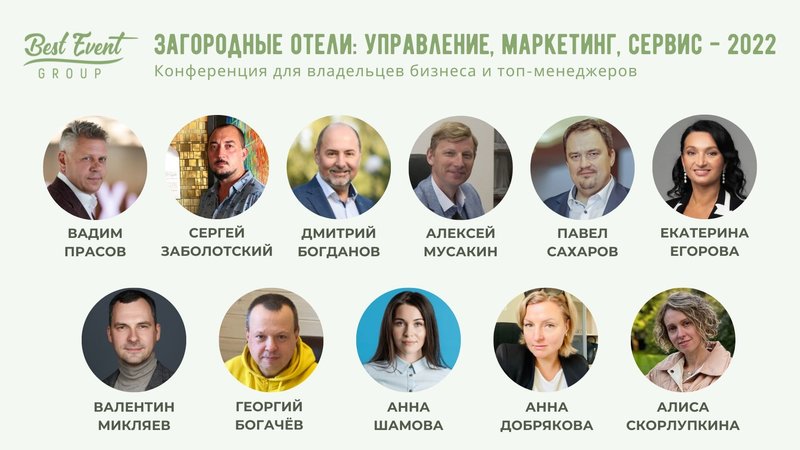 Своим практическим опытом эффективного управления загородными объектами поделятся Вадим Прасов, Алексей Мусакин, Сергей Заболотский, Павел Сахаров, Екатерина Егорова, Дмитрий Богданов, Анна Шамова, Валентин Микляев, Георгий Богачёв, Анна Добрякова, Алиса Скорлупкина и другие ведущие эксперты индустрии гостеприимства.